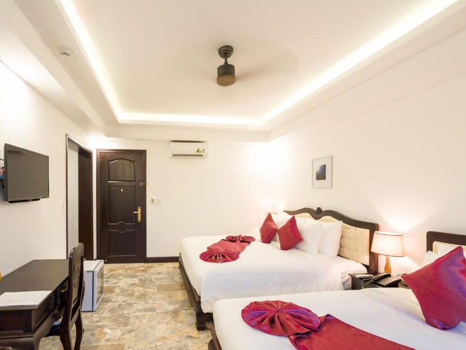 – Diện tích phòng: 32m2 – Sức chức: 3 người lớn + 1 trẻ em (dưới 10 tuổi) Tất cả các phòng đều được trang bị đầy đủ các thiết bị và tiện nghi sang trọng, hiện đại và mới nhất. Mỗi phòng Deluxe Triple ( tầng 3) có ba giường đơn và có cửa sổ nhìn ra khu dân cư. Phòng tắm vòi sen và có đầy đủ đồ vệ sinh cá nhân. |